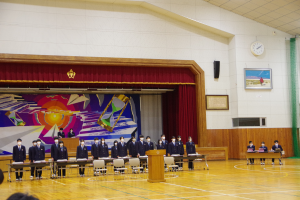 12月24日に2学期の終業式を行いました。終業式では各学年の代表生徒が「2学期の成長と反省」を発表しました。その後の校長講話では、相手を尊重し、仲間を想う「相手意識」「仲間意識」を大切にした紅葉祭での全校生徒の姿や、夢や希望、願いをもって行動する大切さが伝わってきた中学生議会での3年生の姿についての話がありました。また、終業式の前には、中学校総合体育大会冬季大会にスキー競技で出場する二人の選手の壮行会も行いました。明日からは14日間の年末年始休業になります。1年を締めくくる充実した時間をつくり、夢や希望をもって新年を迎える休みにすることを確かめ合いました。
